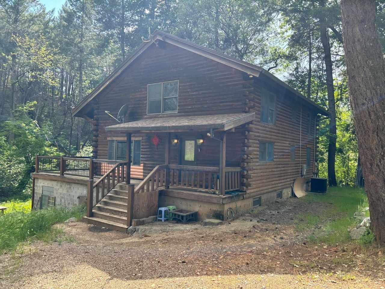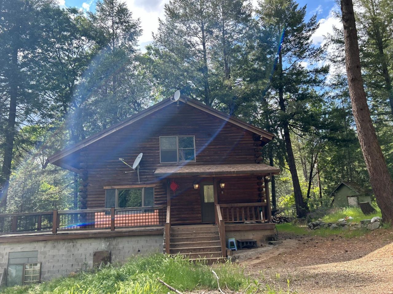 Nestled in the pines just minutes from Lake Oroville and the Feather River, this authentic 3-story log cabin offers rustic charm and unbeatable value. The finished 1,800 sq ft upper levels feature a large kitchen, formal dining, a cozy living room with a wood stove, and a flexible open-air loft. Retreat to the massive top-floor primary suite, complete with dual walk-in closets and a private lounge area.The unfinished first level adds 900 sq ft, already laid out for two bedrooms, a full bath, a second kitchen, and living spaceeasily making this a 2,700 sq ft dream home or separate guest quarters. Outside, relax on the brand-new redwood wrap-around deck, enjoy the peace of mind of a 7-year-old roof, and take in the sounds of your very own year-round creek.