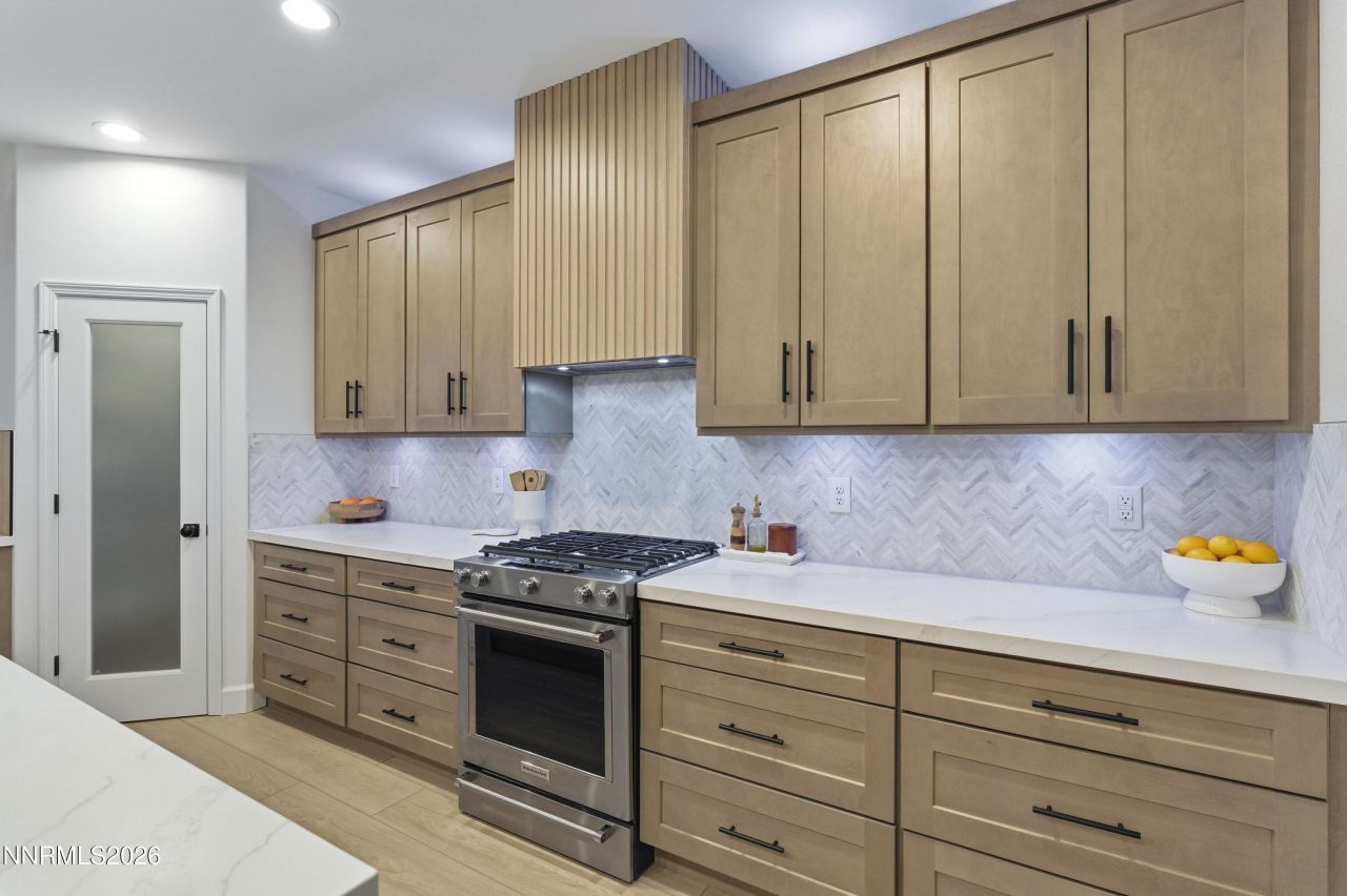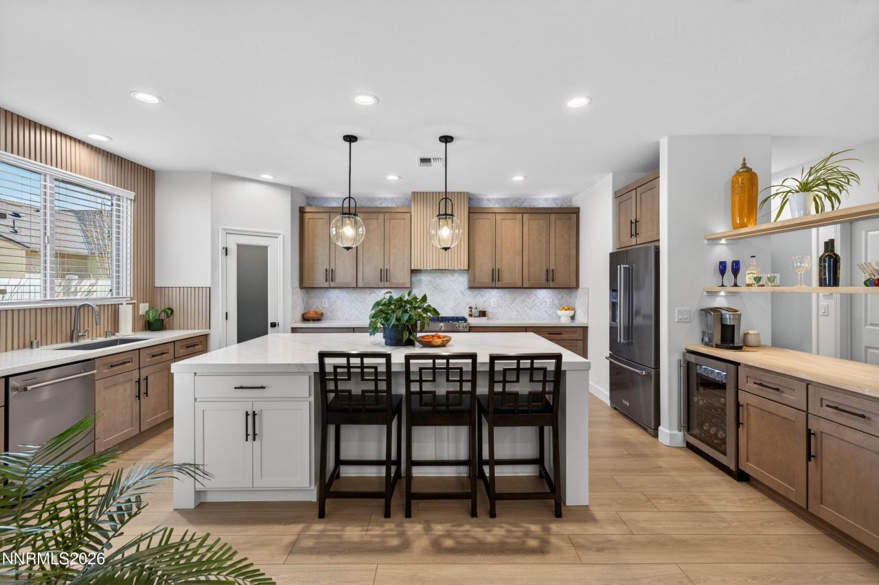 **SEE VIRTUAL TOUR** Have you dreamed of living in a model home? This could be your chance without the wait and expense. This reimagined 2024 built home was transformed after close and now has it all; location, single story, 3 car garage, with a built-in workbench & attic storage, 4 bedrooms, 3 1/2 baths, the primary bath has an extra-large shower & bench, frameless glass, two showerheads & handheld. Two backlit LED anti fog mirrors are mounted on stunning custom tile, above the expansive double sink vanity. This is functional luxury! The HUGE closet is a dream, with ample space for everything you can imagine, a built-in dresser & mirror are the cherries on top. It is truly a showstopper! Storage is abundant throughout the home. The kitchen features 26 solid wood, dovetail, soft close drawers & cabinets with 2 tones, a built-in convection microwave, wine/drink fridge, open shelving with LED lights, a coffee/wine bar, marble herringbone backsplash to the ceiling & paneled hood. The gorgeous quartz counters and huge island complement stainless appliances. A welcoming great room has high end aesthetics like paneling, shelving, a 72-inch electric fireplace that warms effortlessly & cabinetry that spans the whole back wall. The dining space has backlit paneling that adjusts for mood & ambiance with a touch of a button. A guest suite has a private bath & 2 more bedrooms have walk in closets & share a double sink vanity & a separate tub/shower area. All vanities have custom tiling to the ceiling. The backyard has an oversized paver patio, an outdoor fan, lights & gas stub for BBQ & is prewired with a 220 for a hot tub. The front landscaping is maintained by the HOA & so is snow removal on sidewalks & streets, so you're free to enjoy a short drive to Tahoe or all that South Reno has to offer. The Summit Mall with Trader Joes is 5 min away and Downtown Damonte will be within walking distance. Wetland Trail access is under Veterans Pkwy. You can't beat the fantastic location, the upgrades or the price! Welcome Home!