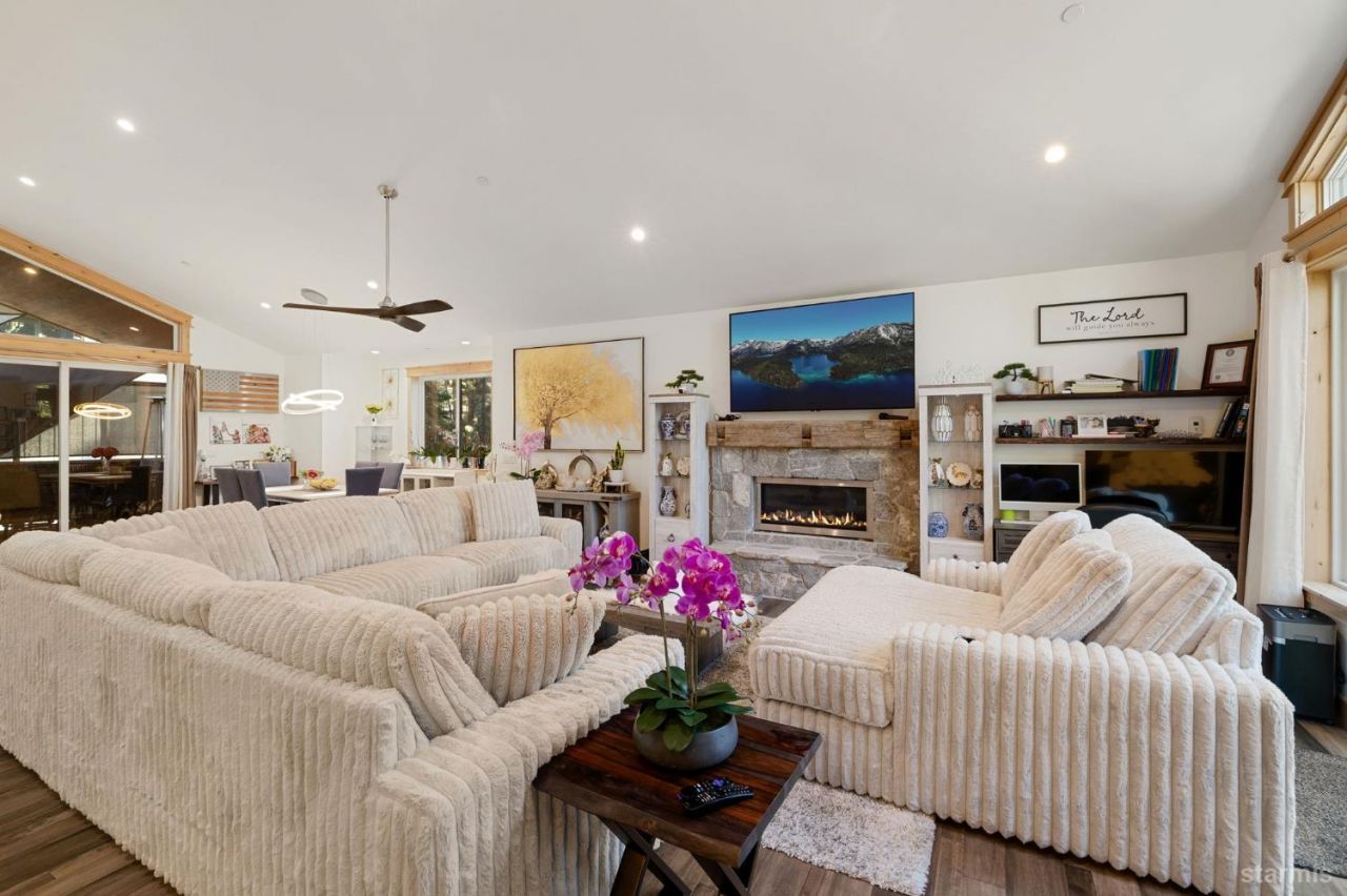 Welcome to your mountain modern dream in the highly desirable Montgomery Estates. Built in 2023 and perfectly positioned on a quiet cul-de-sac adjacent to forest service land, this stunning 5-bedroom, 3-bathroom home blends luxury, comfort, and Tahoe lifestyle seamlessly.Step inside to an airy upstairs living space designed for both everyday living and unforgettable entertaining. The chef's kitchen is a true showpiece, featuring custom alder cabinetry, striking granite countertops, and an expansive island perfect for gathering. Flow effortlessly into the great room, where a cozy gas fireplace anchors the space and large windows invite in natural light and forest views.Outdoor living is elevated with multiple decks, enjoy evenings on the covered back deck complete with a built-in BBQ and hot tub, or unwind on the front deck overlooking the peaceful neighborhood and surrounding pines.The primary suite offers a private retreat with its own fireplace, spa-like bathroom with soaking tub and walk-in shower, and a secluded deck for quiet mornings or evening relaxation. A guest bedroom and full bath complete the upper level.Downstairs, you'll find a spacious family room, additional guest bedrooms, a full bath, and a well-appointed laundry room with sink, ideal for hosting family and friends with ease.The property continues to impress with a three-car garage to store all your Tahoe gear, plus a greenhouse and storage shed in the backyard for added versatility.This is more than a home, it's a lifestyle opportunity in one of Tahoe's most sought-after neighborhoods, where modern craftsmanship meets mountain serenity.