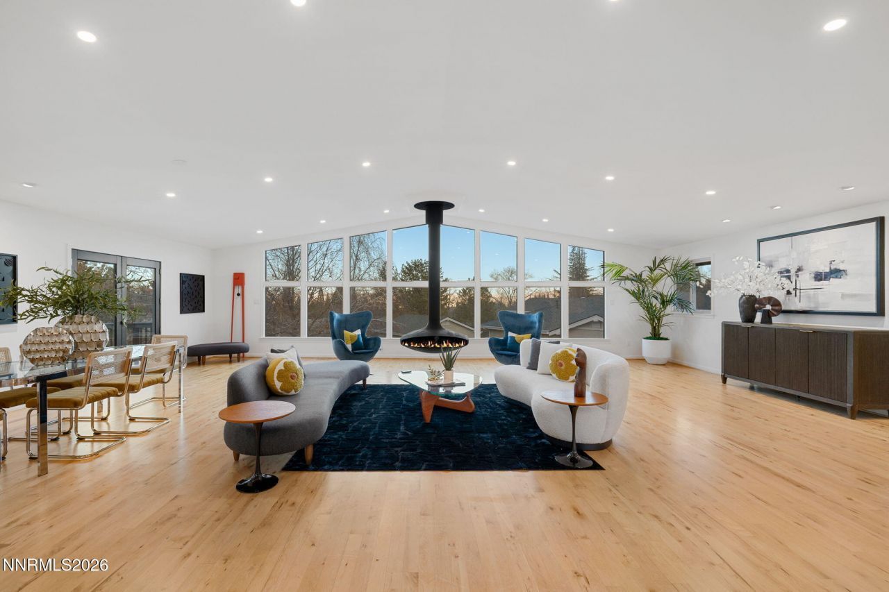 Experience the perfect fusion of mid-century modern architecture and refined sophistication in this fully remodeled residence within the prestigious Lake Ridge Shores Estates. The expansive living room, highlighted by a striking Gyrofocus gas fireplace, opens seamlessly to a spacious deck overlooking the lush, half-acre backyard. Bright and open interiors feature soaring ceilings, refinished hardwood floors, and picture windows that flood the home with natural light. The walk-out basement offers an ensuite bedroom, an impressive cinema room with a 12-foot screen, and a full bar with Bentley Cambria countertops, complete with wine cellar and cocktail area. The primary suite is a true retreat, featuring a spa-inspired bath with a Japanese soaking tub, Robern uplift mirrors, and an expansive closet with custom sliding doors and a dedicated vanity/dressing area. Every detail has been thoughtfully curated-from the sleek metal roof and falling-water style pavers to the timeless finishes throughout-creating a residence that is as stylish as it is functional.