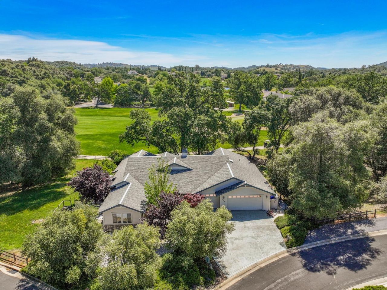 Welcome to luxury living in the highly desirable Greenhorn Creek Golf Community, ideally located on the 4th green & a quiet cul-de-sac. This custom-built, single level home offers stunning golf course views and an exceptional blend of comfort, elegance, and privacy. Step inside to an open, thoughtfully designed floor plan featuring floor-to-ceiling windows in the living room that capture breathtaking views of the course and surrounding landscape. The home showcases beautiful hardwood floors, vaulted wood ceilings in the living room, dining room, and bedrooms that extend seamlessly onto the covered porches, along with 10-foot ceilings throughout, creating a bright and spacious atmosphere perfect for both everyday living and entertaining. The chef's kitchen features granite countertops, an eat-in dining area, and seamless flow into the formal dining room, making it ideal for hosting gatherings or enjoying quiet evenings at home. With three spacious en-suite bedrooms plus a private office, this home offers flexibility for guests, remote work, or multigenerational living. Bathrooms are finished with travertine tile and slate flooring, adding to the home's custom quality and attention to detail. Additional features include a central alarm system with heat sensors for fire detection, motion detectors, and a burglar alarm, providing peace of mind. The three-car garage features epoxy floors, extensive built-in cabinetry, and a utility sink, making it perfect for hobby enthusiasts, along with attic storage above the garage and a Generac generator for added convenience and reliability. The low-maintenance yard is designed for easy living and includes a full irrigation system, mature fruit trees, and concrete walkways surrounding the home, creating a serene, park-like setting. The adjacent lot on the right is included in the sale, providing additional privacy and space, while the adjacent lot on the left is also available for purchase separately, offering a rare opportunity to create your own private estate within one of the area's most sought-after golf communities.