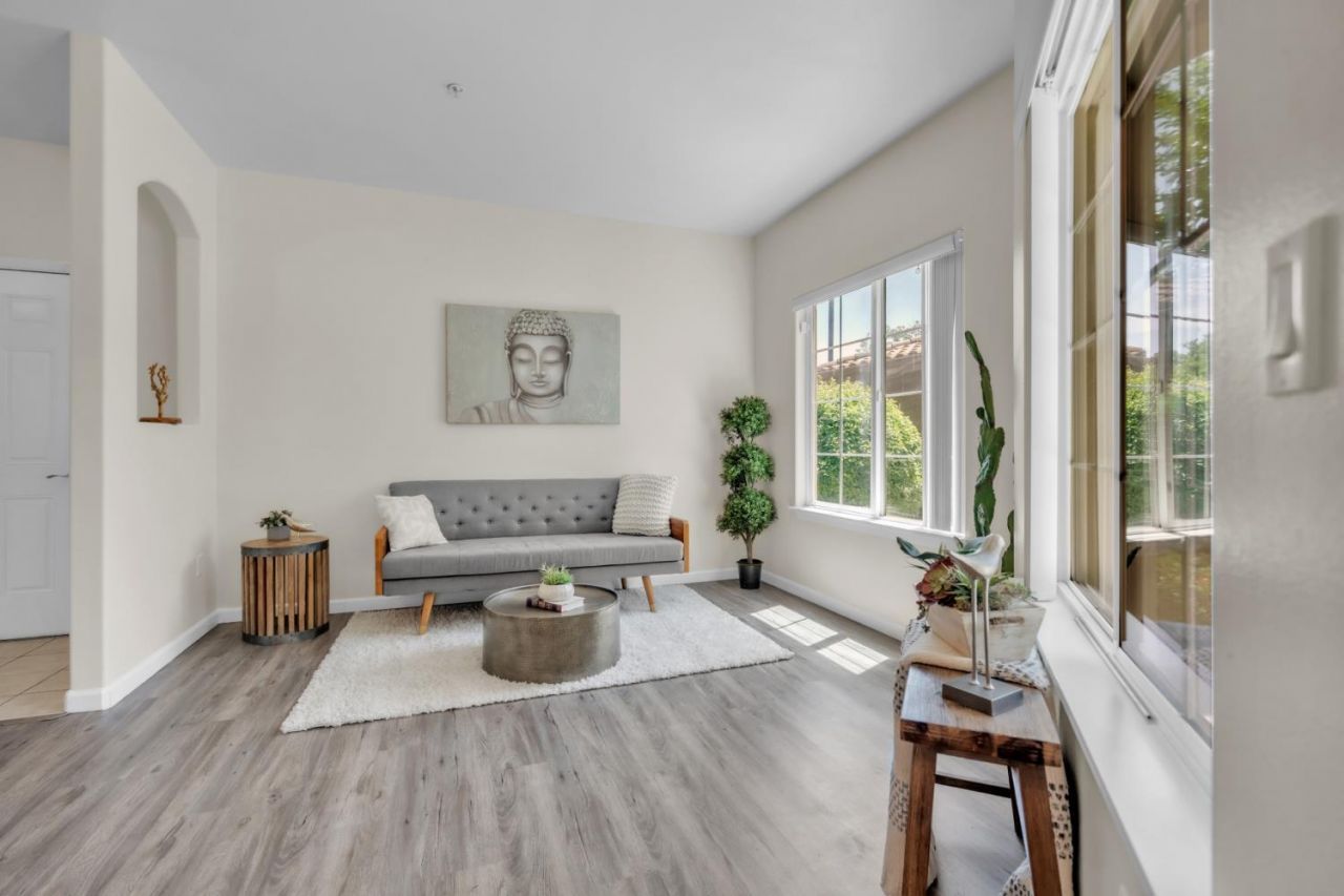 Tucked away in the back of the highly sought-after Bella Rose gated community, this ground-level 2-bedroom, 2-bath condo offers the privacy and quiet setting buyers are looking for. With 958 square feet of bright, open living space, this home combines comfort, functionality, and tasteful updates throughout. Inside, you'll find luxury vinyl plank flooring, fresh two-tone paint, and elegant window coverings that create a clean, move-in-ready feel. The updated kitchen features stainless steel appliancesincluding the refrigeratorand opens seamlessly to the living and dining areas, perfect for both everyday living and entertaining. Bella Rose residents enjoy gated entry, a pool and spa, clubhouse, and fitness center. Ideally located near the new Costco, shopping, dining, top-rated schools, and easy freeway access.
