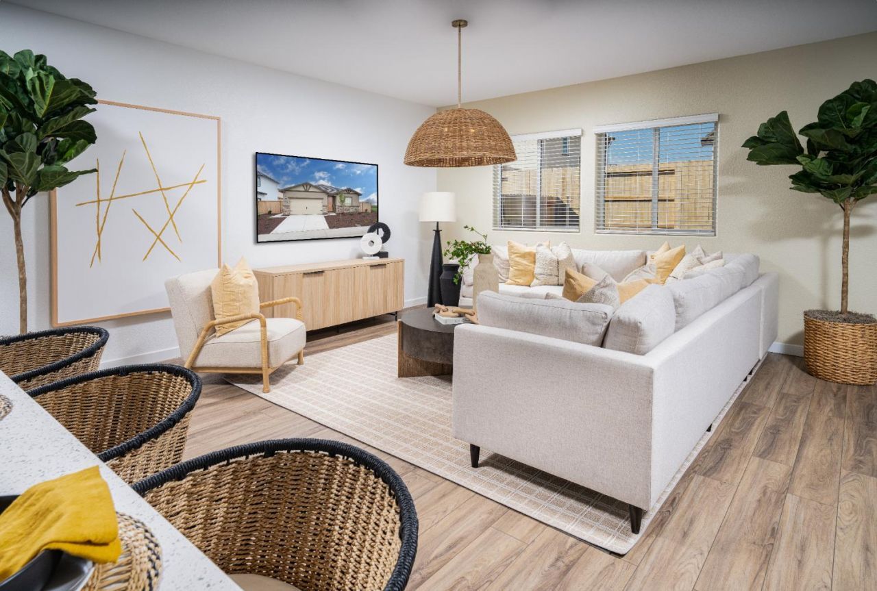 Step into this never-lived-in former Lennar model home, offering thoughtful design, modern features, and the ease of single-story living. With 1,944 sq. ft., 4 bedrooms, and 2 bathrooms, this home delivers a comfortable and functional layout perfect for everyday life. Just off the entry are two secondary bedrooms and a full bath, with a fourth bedroom tucked down the hallideal for family, guests, or a home office. The heart of the home is a bright and open space where the kitchen, dining area, and Great Room come together seamlessly. The kitchen features a large center island, upgraded cabinetry, and designer finishes, making it both stylish and practical. The owner's suite is privately located at the back of the home, complete with a walk-in closet and spacious en-suite bathroom. As a former model, this home includes smart home technology, energy-efficient systems, and builder-curated upgrades throughout. Outside, the professionally designed and landscaped backyard creates a peaceful spot to relax or entertain. Located near parks, schools, and shoppingwith special financing options availablethis move-in ready home offers comfort and quality from the start.