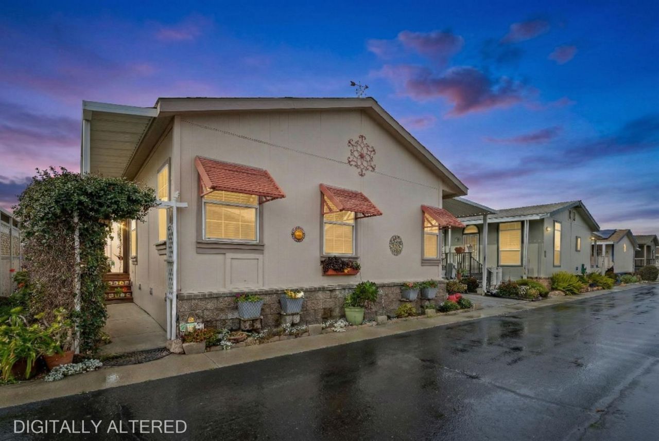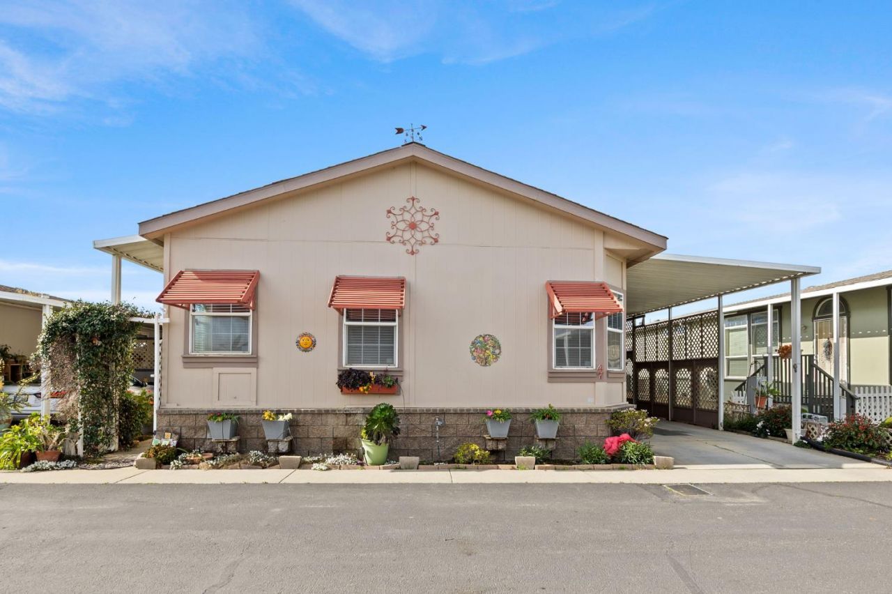 Bright & Open Floor Plan! 3 bedroom 2 bath well maintained doublewide mobile home with a possible 4th bedroom/Den option. The spacious kitchen features a center island with hanging pot storage overhead. Pantry closet plus abundant cabinetry provide exceptional storage. Kitchen appliances include dishwasher, gas range/oven and built in microwave. Refrigerator is also included. Large Living room offers large windows overlooking the covered car carport. Separate dining area with slider door leads out to the private patio area. Spacious primary suite with oversized tub and shower and features separate double vanities. Indoor laundry room with cabinetry for additional storage, washer and dryer included. Side yard with additional room to garden. Two storage units located in the carport for added storage. 2 car carport parking, close proximity to guest parking and clubhouse/swimming pool areas.