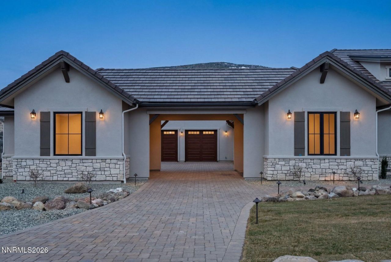 Commanding sweeping mountain views from a private homesite backing to open space, this newly constructed custom estate in the prestigious guard-gated community of ArrowCreek presents a seamless function of timeless design and everyday comfort. Thoughtfully built, the home showcases warm organic finishes including white oak cabinetry, Mediterranean Collection wide plank hardwood flooring, and designer surfaces. The versatile floor plan offers five bedrooms plus a dedicated office, with a luxurious main-level primary suite. The suite features heated tile floors, a spa-inspired rain shower, under-cabinet lighting and a custom walk-in closet complete with built-ins, and center island. Three additional bedrooms and a dedicated office are located on the main level, while an upstairs junior suite provides exceptional flexibility with a bonus room, kitchenette, dual walk-in closets and generous storage area. The chef 's kitchen is an anchor of the home, designed for both beauty and function. The kitchen features Taj Mahal quartzite countertops, premium Monogram appliances including a 48 gas range, built-in refrigerator, double ovens, a 30 microwave, and an expansive pantry with built-in cabinetry and quartzite surfaces. Seamless indoor-outdoor living awaits with a large covered patio featuring an outdoor kitchen and a grand Heat & Glo fireplace for year-round enjoyment; all set against gorgeous mountain views. Additional highlights include an oversized fully finished three-car garage plus an additional oversized detached garage/workshop both with insulated garage doors, an elegant paver driveway all with a grand porte cochere entrance. Ideally located near Reno-Tahoe International Airport and world-class recreation in the Lake Tahoe area, this exceptional residence offers luxury, privacy, and breathtaking natural surroundings.