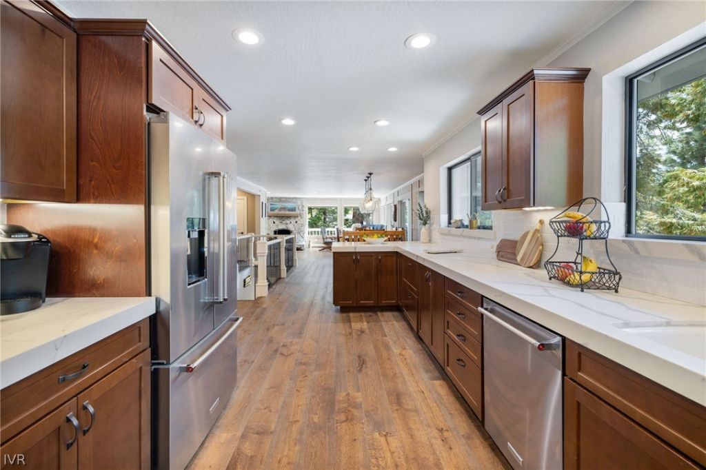 This home offers a perfect blend of comfort and functionality in a beautiful natural setting. Great room floor plan with remodeled kitchen and eat-in bar that opens to the living area. Large, sunny wrap-around deck overlooking a creek and wooded setting adds a serene outdoor element that is great for enjoying nature and entertaining friends and family. Kitchen features quartz slab counter tops, Kitchen Aid appliances and walk-in pantry with built-in wine refrigerator. Primary bedroom is located on the main living area and features his and her vanities, jacuzzi-style tub, shower and walk-in closet. Guest bedroom, full bath and an office featuring a built-in Murphy bed that overlooks the creekside setting adds versatility and comfort for visitors or work-from-home needs. Separate family room and two additional bedrooms with full bath are located on the lower lever. Oversized 3 car garage with built-ins and car rack for additional car storage.