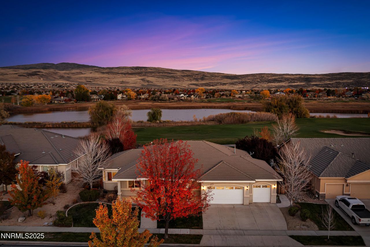 This exceptional single-story custom home offers unparalleled luxury and comfort. Enjoy breathtaking views of the Red Hawk Golf Course 18th hole, wetlands, trees, a serene pond, and majestic mountains right from your backyard. Step inside to an inviting open floorplan with soaring 10-foot ceilings and elegant touches like crown molding. The great room boasts a cozy fireplace, custom built-in shelves and cabinets, and a stunning window wall with Anderson doors that perfectly frames the golf course view and water feature. This space seamlessly flows into a casual dining area, distinguished by a coffered ceiling, bay windows, and a ceiling fam. The gourmet kitchen is a dream, featuring a center island with a breakfast bar, a Wolf gas range, custom wood cabinets (many with elegant glass fronts and convenient pull-outs), under-cabinet lighting, walk-in pantry and a butler's pantry. A guest bath is conveniently located off the main hall. The luxurious primary suite offers a private sanctuary with a fireplace, custom built-ins, a coffered ceiling, a ceiling fan, and glass doors leading to the patio. The large walk-in closet is bathed in natural light. Indulge in the travertine bathroom, complete with a spacious jetted tub under a window, a walk-in tiled shower with two shower heads, a long vanity with two sinks, and a separate toilet room. On one side of the entrance hall, you'll find a formal dining room and on the other side a dedicated office featuring elegant glass French doors. Gleaming hardwood floors flow throughout the main living areas enhance the home's sophisticated appeal. Two additional bedrooms conveniently share a Jack-and-Jill bathroom. The extra-large three-car garage is finished and provides ample storage along with a practical workbench. The backyard is a true oasis, enjoying morning sun and afternoon shade. A covered patio spans the back of the house, offering a perfect spot for relaxation. The lush lawn features mature landscaping and a private bench, ideal for enjoying an evening chat. The storage shed is also included, adding to the home's abundant storage options. A comprehensive sound system with indoor and outdoor speakers and all components is included. The water heater was replaced in 2022. The kitchen refrigerator, washer, dryer, storage shed, murphy bed, and three televisions are included, adding exceptional value to this remarkable property. A short stroll takes you to David's Grill and Bar while golf is available on two championship golf courses. For a monthly membership, the community amenities include a large outdoor pool, separate kids' pool, volleyball pits, a fully equipped gym, and fitness classes such as Pilates, yoga, and spin. Golf memberships are also available. This home is truly a masterpiece of design and comfort. Make an appointment to see it today!
