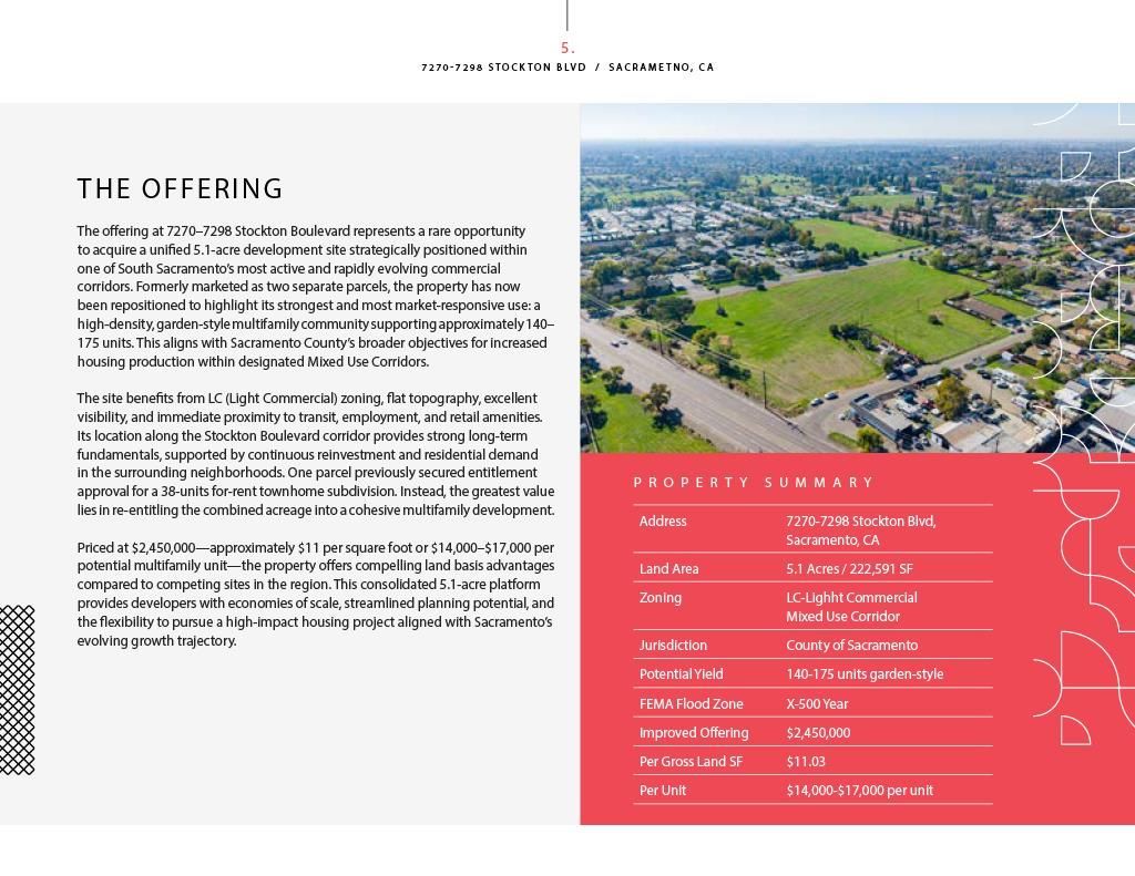 Prime 5.1‑Acre Stockton Boulevard Infill Site High‑Density Multifamily Redevelopment Opportunity The offering at 7270-7298 Stockton Boulevard represents a rare opportunity to acquire a contiguous 5.1‑acre development site along one of South Sacramento's most active and rapidly evolving commercial corridors. Formerly marketed as two separate parcels, the property has been repositioned to reflect its highest and best use: a garden‑style multifamily community supporting approximately 140-175 units, consistent with Sacramento County's Mixed Use Corridor objectives and strong housing demand. Zoned LC (Light Commercial), the site allows for integrated residential development and benefits from flat topography, excellent visibility, and proximity to transit, employment centers, and neighborhood retail. One parcel previously received County approval for a 38‑unit rental townhome project, demonstrating clear entitlement precedent and County support for residential uses. Combining both parcels unlocks greater density, efficiency, and long‑term value through a unified multifamily plan rather than smaller, disconnected developments. Offered at $2,450,000approximately $11 per square foot or an attractive $14,000-$17,000 per potential multifamily unit - the property provides a compelling land basis compared to competing sites in the region. Typical densities in the corridor range from 28-35 units per acre, supporting a 140-175 unit garden‑style project aligned with current market feasibility. Key advantages include economies of scale, integrated site planning, shared infrastructure, centralized amenities, and reduced per‑unit development costs. Positioned within a designated Mixed Use Corridor, the site benefits from County policies encouraging higher‑density infill, streamlined approvals, and corridor revitalization. Surrounding uses include existing multifamily communities, neighborhood commercial services, and vacant LC parcels with complementary redevelopment potential, reinforcing sustained residential demand. This is a rare, high‑impact opportunity to deliver a scaled multifamily project along Sacramento's resurgent Stockton Boulevard corridor with strong fundamentals, flexible zoning, and long‑term upside.