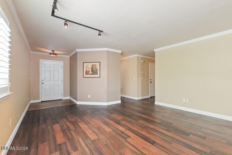 Lovely single level home, shows pride of ownership! The inviting living room leads into the beautiful and functional eat-in kitchen. Granite countertops and stainless appliances, refrigerator (included). Undermount farmhouse sink and built-in seating for the corner-nook table, and a slider to backyard. Rich wood plank flooring and crown molding throughout most of the home. Spacious primary suite with garden tub/shower combo, dual vanities, granite counters and tile flooring. Guest bath with a tub/shower combo and pedestal sink. Full sized washer and dryer (included) with cabinets and folding area. Central AC, ceiling fans in all three bedrooms. Plantation shutters in living room and primary. Attractive, arched, two panel interior doors. Home has solar panels on roof which are completely paid off and under warranty. You will have a very small electric bill. Xeriscape front and backyard, back patio, pear, plumb and apple trees. Close to Sierra Sage Golf Course, shopping and schools.