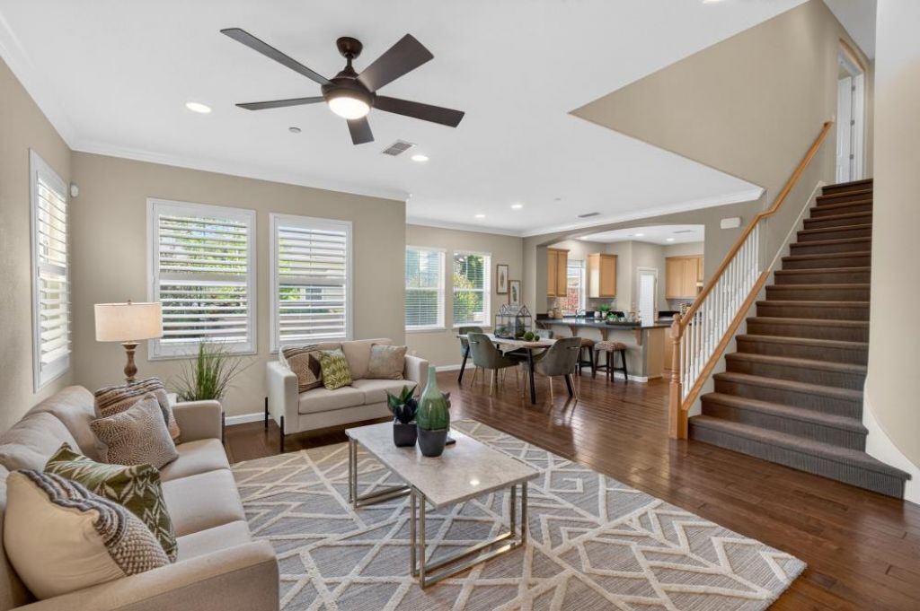 Stunning newer home built in 2013, located in the highly sought-after Riverlake community, just a short walk to the Sacramento River and a beautiful man-made lake right across the street. This exceptional residence offers 3 bedrooms and 3 full bathrooms, including a convenient downstairs bedroom and bath, ideal for guests or multigenerational living. The thoughtfully designed open-concept floor plan features a spacious great room and dining area seamlessly connected to a fantastic kitchen, complete with granite countertops, maple cabinetry, designer tile backsplash, stainless steel appliances, a large island with bar seating, and recessed lighting. Elegant engineered wood flooring and designer carpeting flow throughout, complemented by crown molding, shutters, ceiling fans, and a stylish tile fireplace with built-in cabinetry. The expansive primary suite serves as a private retreat, boasting a luxurious bath with soaking tub, separate shower, dual sinks, and a generous walk-in closet. An enormous loft provides versatile space perfect for a game room, media area, or additional living space. Recent upgrades include three Toto toilets, a newer garbage disposal, and kitchen faucet. Additional highlights include upgraded tile finishes in bathrooms, glass tub doors, a finished garage with remote access panel, and a charming patio ideal for relaxing or entertaining. 24 hour roving security. Combining modern upgrades, flexible living spaces, and an unbeatable location, this home truly has it all.