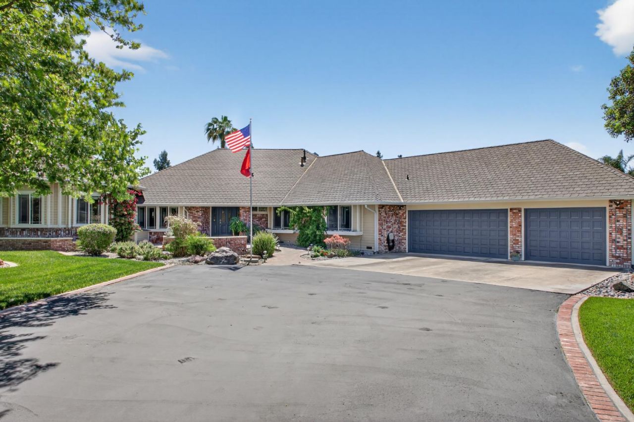 This stunning custom single-story home offers 3,229 sq ft with 5 bedrooms and 3.5 bathrooms on a full acre. Character and charm shine through the beautiful brick exterior. A welcoming front driveway features a tranquil waterfall and fish pond, creating a peaceful first impression. Inside, the home is designed for comfort and function with a formal living room featuring a wood-burning fireplace, a dining area, and a spacious family room with vaulted ceilings, wood beams, and a floor-to-ceiling brick fireplace. The unique Octagon Room off the living area includes a gas fireplace, hardwood floors, and flexible use as an office or additional living space. The remodeled kitchen opens to the family room and features granite countertops, stainless steel appliances, and an ideal layout for everyday living and entertaining. The primary suite includes a walk-in closet and an updated bathroom with a custom tile shower. Additional highlights include abundant custom cabinetry, a large laundry room with sink, crown molding, new carpet, fresh paint, and a newer tankless water heater. The home also includes leased solar with 37 panels and two extended batteries. The backyard is a true oasis with a pool, spa, expansive lawn, mature and fruit trees, and multiple covered, lighted patios totaling approx. 2,008 sq ft. The property offers excellent access with a large side yard, RV parking, driveway access to the detached structure, ample parking, and an oversized 3-car garage. Additional structures provide exceptional versatility, including an approx. 1,840 sq ft detached shop designed for potential ADU conversion. It is fully insulated with dual pane windows, sheetrock, paint, extensive lighting/electrical, a half bath, 200-amp service, and a 4-inch waste line to septic. Also included are a separate 252 sq ft unit, a 270 sq ft detached retreat ideal for an office, gym, or studio, and multiple storage sheds. Ideal for multi-generational living, a business owner, or hobby enthusiast, this property offers space, flexibility, and endless possibilities.