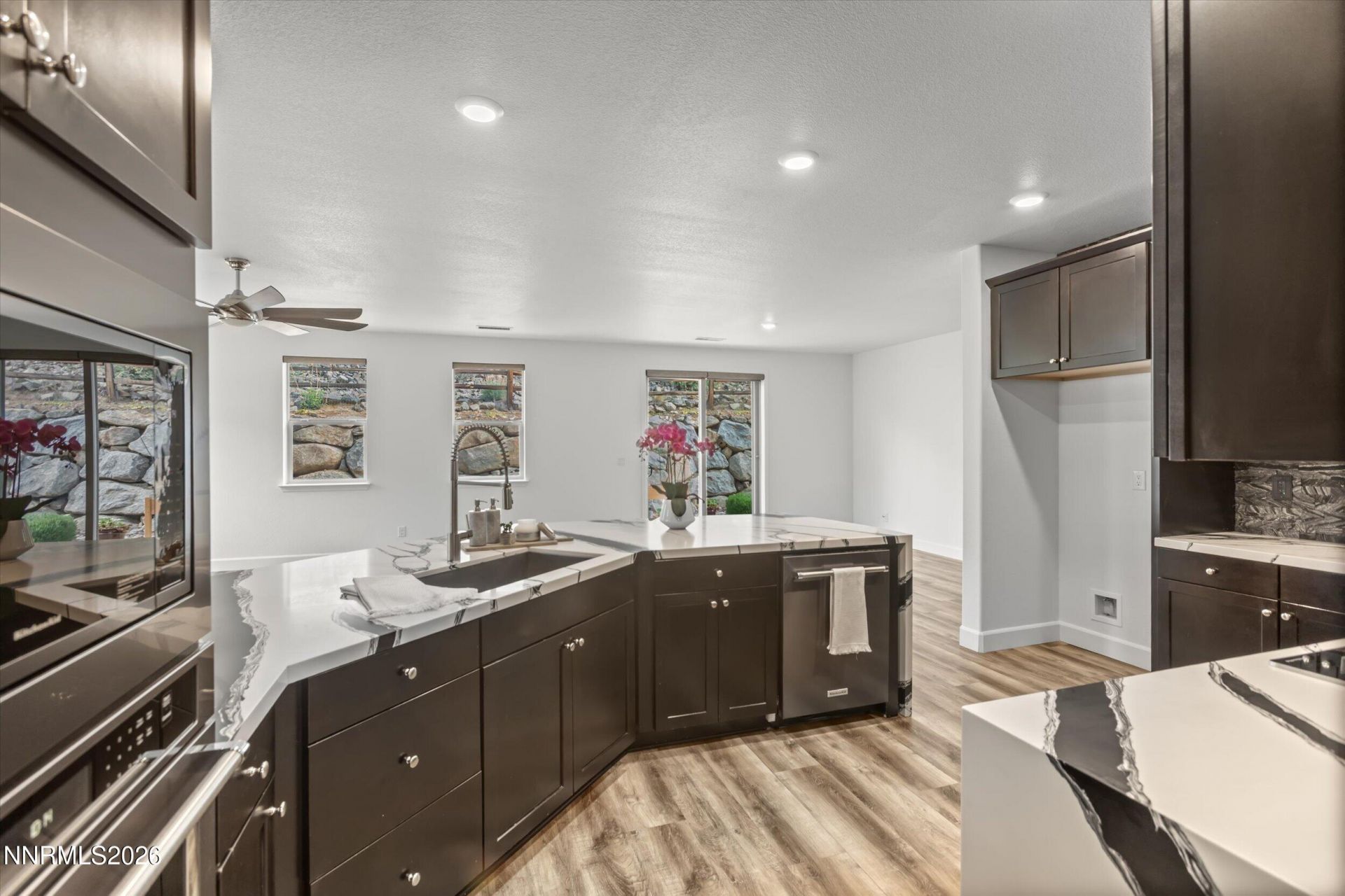Welcome to this beautifully updated single-story home in the highly desirable Somersett golf community in Reno. Offering 2,409 square feet of thoughtfully designed living space, this residence combines modern design, functionality, and the ease of single-level living. At the center of the home is a designer-inspired kitchen featuring striking waterfall-edge countertops, lovely cabinetry, and a dramatic full-height stone backsplash. The oversized island anchors the space, creating the perfect setting for entertaining, casual dining, and everyday living. The open-concept layout flows seamlessly into the main living areas, enhanced by natural light throughout. Located in a cul-de-sac, this home's curb appeal is equally inviting, featuring a private, covered entry that sets a warm and welcoming tone from the moment you arrive. Additional highlights include a spacious tandem garage-ideal for extra vehicles, storage, or a home gym setup-along with the comfort and convenience of a single-story floor plan. Located within the master-planned Somersett community, residents can enjoy access to golf, clubhouse, fitness center, resort-style pools, and miles of scenic walking and biking trails, all surrounded by stunning mountain views. This is a rare opportunity to own a move-in-ready, upgraded home in one of Reno's most sought-after communities.