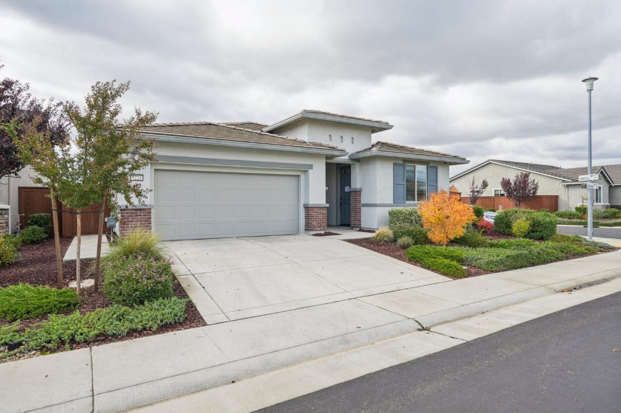 Price Improvement ***************** Located in the sought-after 55+ gated community of Dakota at Elk Grove, this beautifully maintained single-story home sits on a premium corner lot and offers three bedrooms and three full bathrooms. Built in 2020, the open-concept floor plan features wide-plank flooring, abundant natural light, and a spacious great room that flows seamlessly into the designer kitchen with espresso cabinetry, quartz countertops, stainless steel appliances, subway tile backsplash, and an oversized island perfect for entertaining. The thoughtfully designed layout includes a private junior suite and a spacious primary retreat with a walk-in closet and dual-sink vanity. Energy-efficient features include owned solar, a tankless water heater, and EV charging in the garage for added convenience and long-term savings. Step outside to a low-maintenance backyard with a sky-view design, expansive concrete and river rock hardscape, upgraded side yard, and a custom retaining wall with integrated lighting for evening ambiance. Residents of this gated active adult community enjoy resort-style amenities including a pool, spa, fitness center, tennis courts, walking trails, lounge areas, and a dog park. Conveniently located near Costco, Target, Sprouts Farmers Market, parks, dining, medical facilities, and with quick access to Highway 99, this home combines comfort, style, and convenience in one of Elk Grove's most desirable 55+ communities.