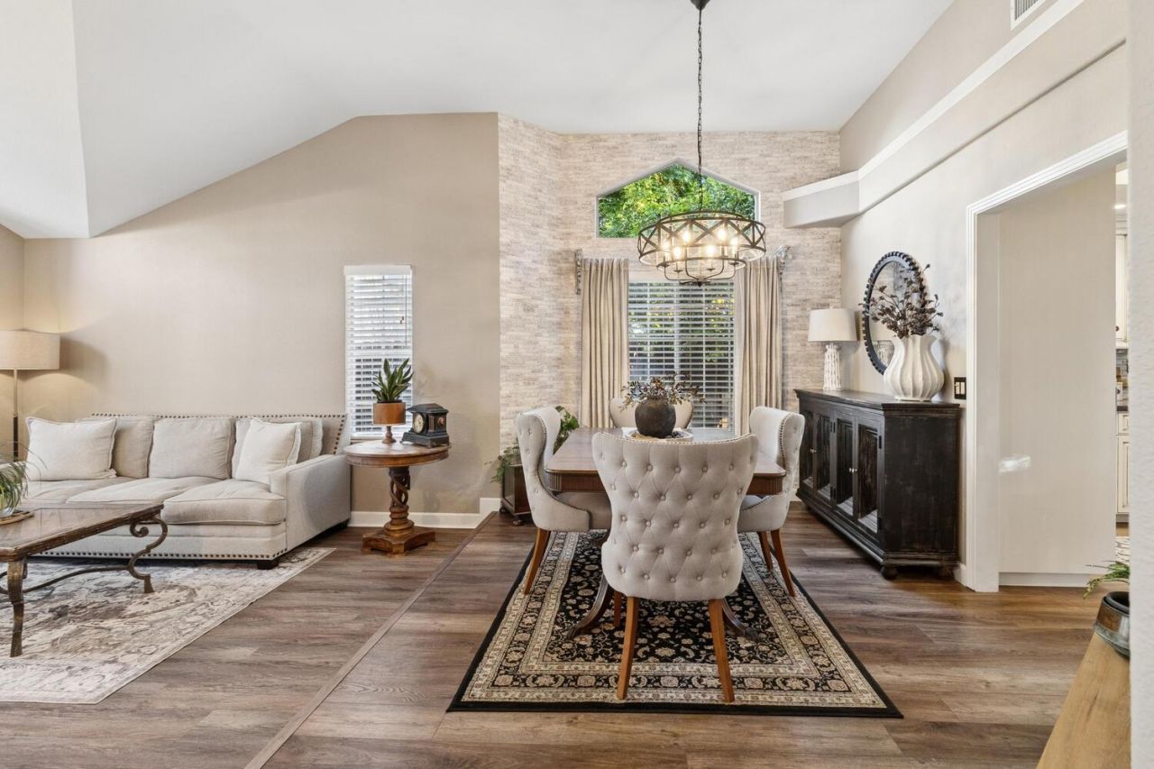 From the moment you arrive, curb appeal shines with pristine landscaping that welcomes you to this stunning home in one of Elk Grove's most sought-after areas. A custom front door with pebble glass accents opens to reveal beautiful LVP flooring and a bright, open layout. Inside, you'll be greeted by soaring ceilings, updated light fixtures, and thoughtful attention to detail at every turn. The formal living and dining areas offer a welcoming space for entertaining, while the cozy family room with fireplace provides the perfect place to relax, all with views of the stunning backyard. The stylish kitchen is a true centerpiece, showcasing custom cabinetry, granite countertops, stainless steel appliance package, gas stove, and a charming breakfast nook for everyday dining. This spacious home features 4 bedrooms and 2.5 bathrooms, including a serene primary suite with vaulted ceilings and direct access to the backyard. The ensuite bath includes dual sinks, a soaking tub, separate shower, and ample space to unwind. Step outside to your private oasis, complete with a sparkling pool, separate spa, and multiple areas for dining and lounging surrounded by lush landscaping. Conveniently located near shopping, dining, and within the highly desirable Elk Grove School District, this home truly has it all!!