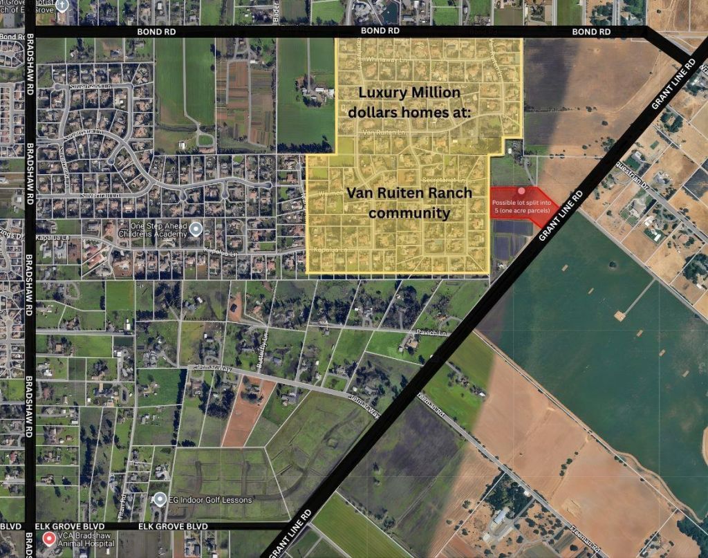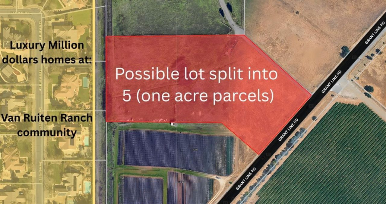 Incredible Opportunity with Unlimited Potential - Prime 5-Acre Development Parcel! Calling all builders, developers, and visionary investors. This is the opportunity you've been waiting for! Ideally positioned along highly sought-after Grant Line Road, this exceptional 5-acre parcel offers a rare chance to create something truly special in one of the region's most desirable growth corridors. Surrounded by established and emerging communities, including the prestigious Van Ruiten Ranch, this property is nestled among million-dollar homes, making it a prime candidate for a high-end residential development or a stunning generational estate. With the potential to subdivide into five separate 1-acre parcels (buyer to verify), the possibilities here are both flexible and lucrative. Whether you're looking to build a luxury enclave of custom homes, design a family compound, or invest in a land hold with strong future upside, this property delivers on all fronts. The flat, usable acreage provides a developer-friendly canvas, allowing for efficient planning, design, and build-out. Strategically located on a major thoroughfare connecting Highway 99 to Highway 50, this property benefits from excellent visibility, accessibility, and consistent traffic flow ideal for long-term value and desirability. Just minutes from shopping, dining, public transportation, and major employment hubs, including the rapidly expanding Sky River Casino and proposed highly anticipated sports complex, the location supports both lifestyle and investment appeal. Opportunities like this are increasingly rarelarge parcels in prime locations with subdivision potential and proximity to luxury communities don't come around often. Whether you're a seasoned developer or a forward-thinking buyer looking to capitalize on growth, this is your chance to secure a premier piece of land in a high-demand area. Don't miss the chance to bring your vision to life and create lasting value in one of the area's most promising locations!